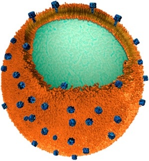 It’s a wrap: This illustration shows how the nanosponge’s solid polymer core (green) is surrounded by a red blood cell membrane (red). The blue structures represent absorbed toxins.