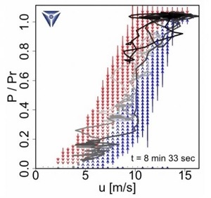 Screenshot … showing the power output vs. wind speed signals for a wind turbine. Credit: Patrick Milan, et al. ©2013 American Physical Society