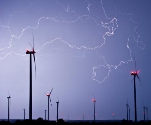 Lightning fills the sky above a wind farm near Jacobsdorf, eastern Germany in May 2013. With political clout firmly behind renewables, priority is given in the national power grid to so-called “clean” electricity.