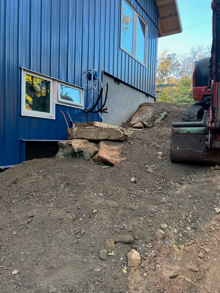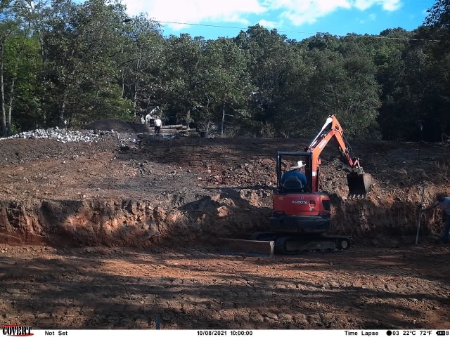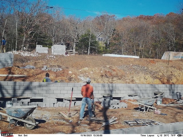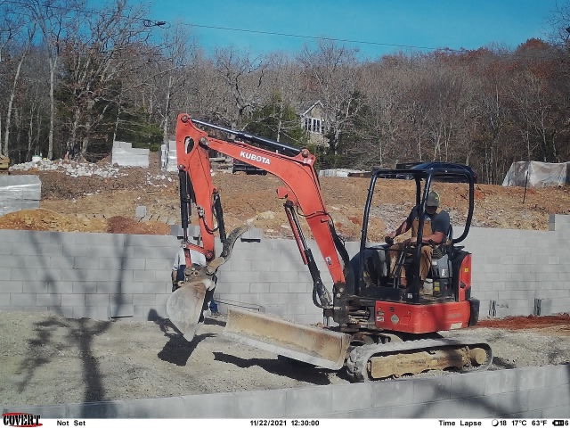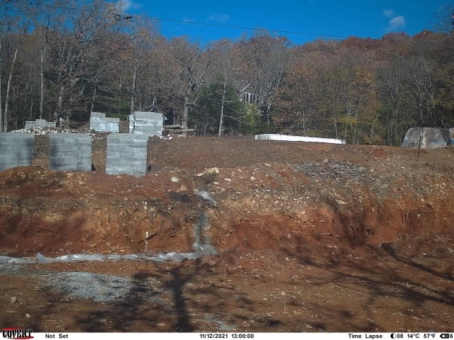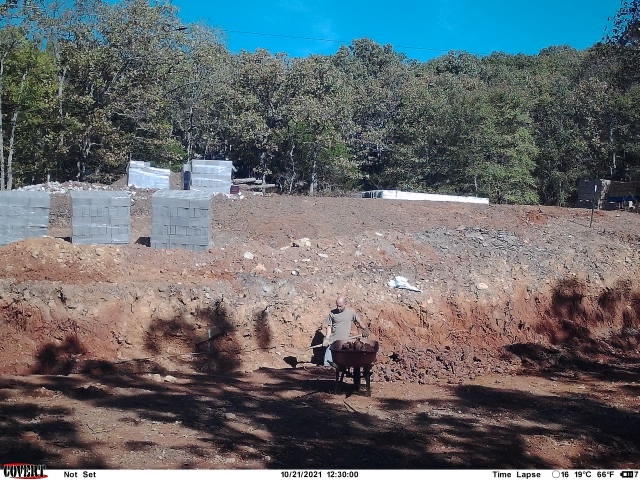Our smoke signal, Saturday morning driving up.The pond was deeper than it seemed when full of weeds etc.We have a Wildlife Cam set up to catch things like the Crazy Honda Ridgeline and similar. September 29th inspecting…The slope up from the south end of the house after clearing. Around end of Sept.The new swale at the bottom of the knob, from near the neighbors boundary.Swale from the opposite end…this used to be about 10 ft lower in the center.October 5th, again from the WildLife Cam…it’s wild man. Center, Alex our builder, foundation level of the lower floor, ‘is it deep enough?’Shane taking a break, its now a few feet deeperNext day, all gone. 75 big dump truck loads of material removed in total many, many more moved around. Luckily our neighbor wanted a new parking apron so it only had to move a couple of hundred yards.October 8th, the footing trenches are dug. Then the rebar put in place to tie the footings together in the pour. The concrete pour.Read the caption…Now October 21st, Concrete scheduling requires 4 contractors and no rain. The last two times we had the contractors lined up it rained. The 19th torrential and Ryan (Alex’s business partner/apprentice) is digging the dirt out so the rebar is properly exposed.Now Nov 2nd, finally the pour. It is cold and misty rain but we are now ~4ish weeks behind schedule. Plastic to keep it a bit warmer and dryer.Sigh, another week, the block guy had gone on to other jobs. Morning1:3011:00 next day…finished and out of there…22nd and the compact-able gravel is being spread and compacted. The ever adaptable Alex compacting some more with another layer waiting. This is more than minimum required ‘out in the county’ we had geotechnical services in to assess the soil etc. The soils not bad but the slow and cutting had them suggest doing this we are doing this to make sure the foundation is very stable come what may.Me today, Nov 25th, the compaction tests all passed and the top gravel on which the concrete slab will be poured was added to fill up the walls to nominal grade. This back side view shows one of my pet needs, highest grade water proof membrane to make sure we do not get ground water seeping in. Another $1000 bucks here or there for a bit more peace of mind? Priceless.From the West end of the wall. Gravel on the footers, then an 8 inch drain then gravel then dirt. Then they have to come back and do another footer cut for the ‘overbite’ of the upper floor.South east corner ground floor (my office.) gravel fill to the lip. You can see the insulation that is part of the passive home design.View from my office looking EastLooking SouthSouth East looking West It was SOOOOO peaceful cool wind rustle of leaves…sigh
