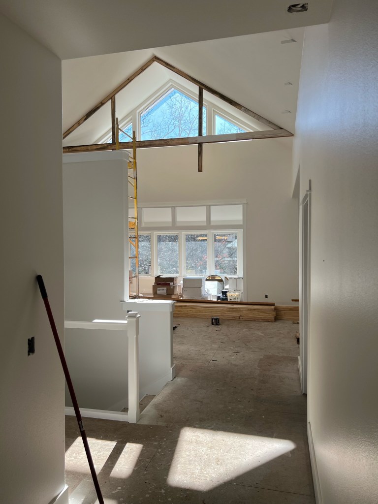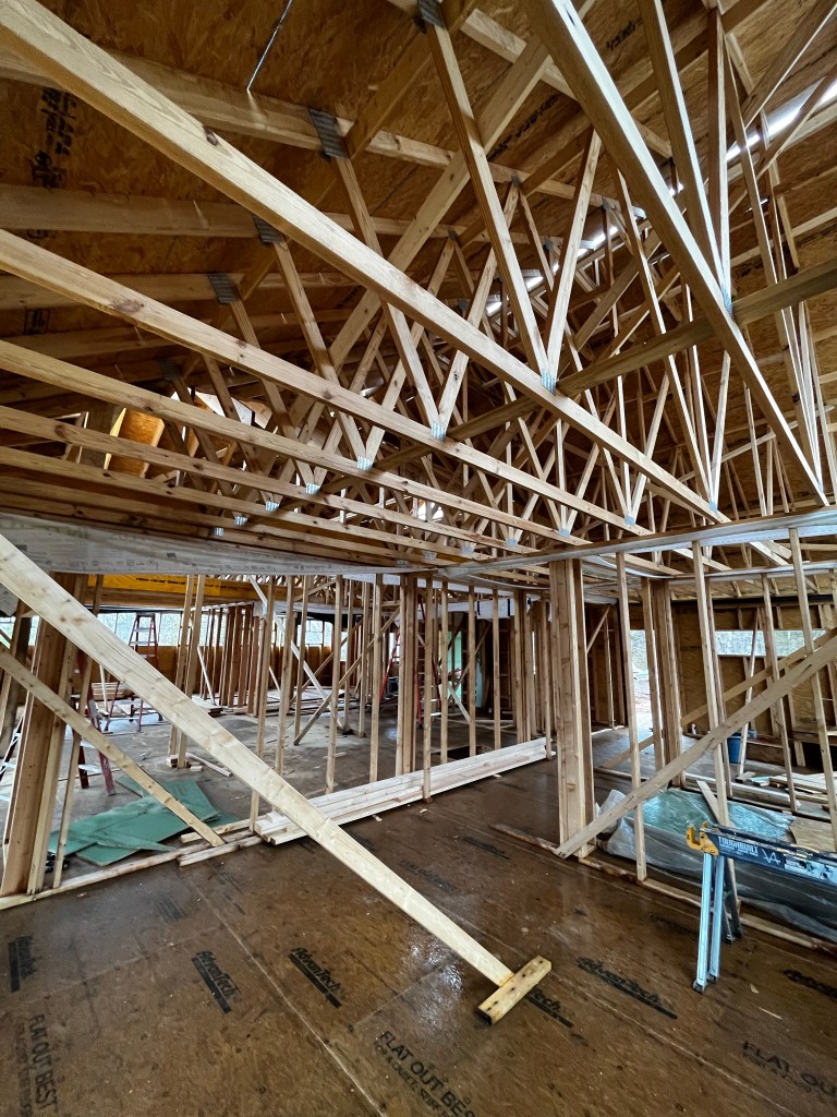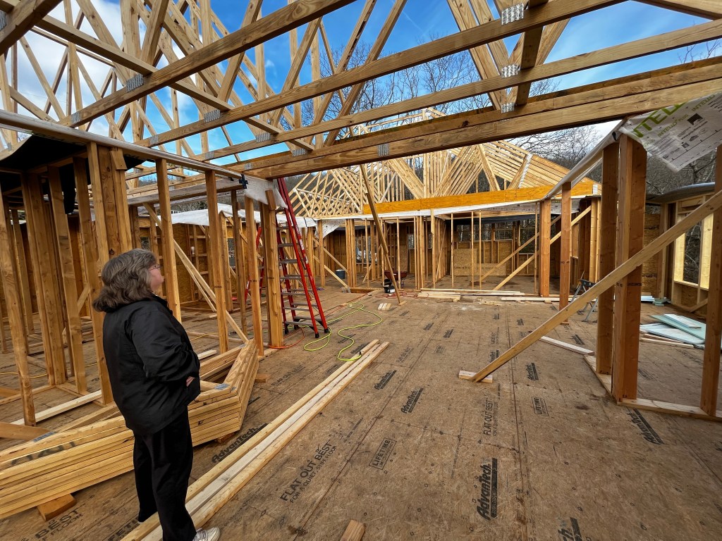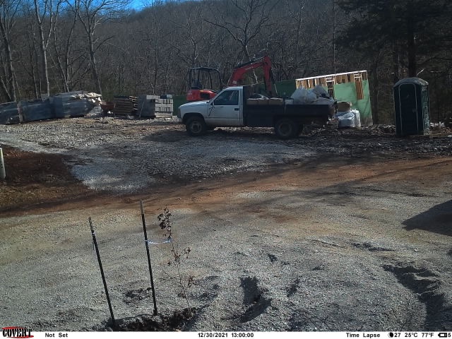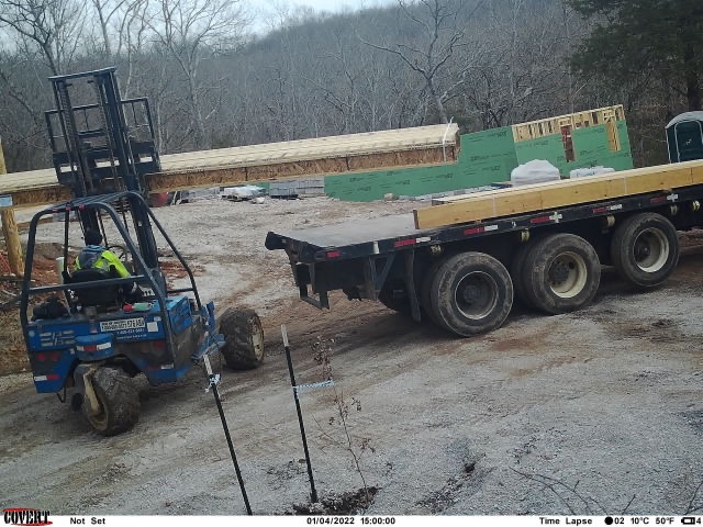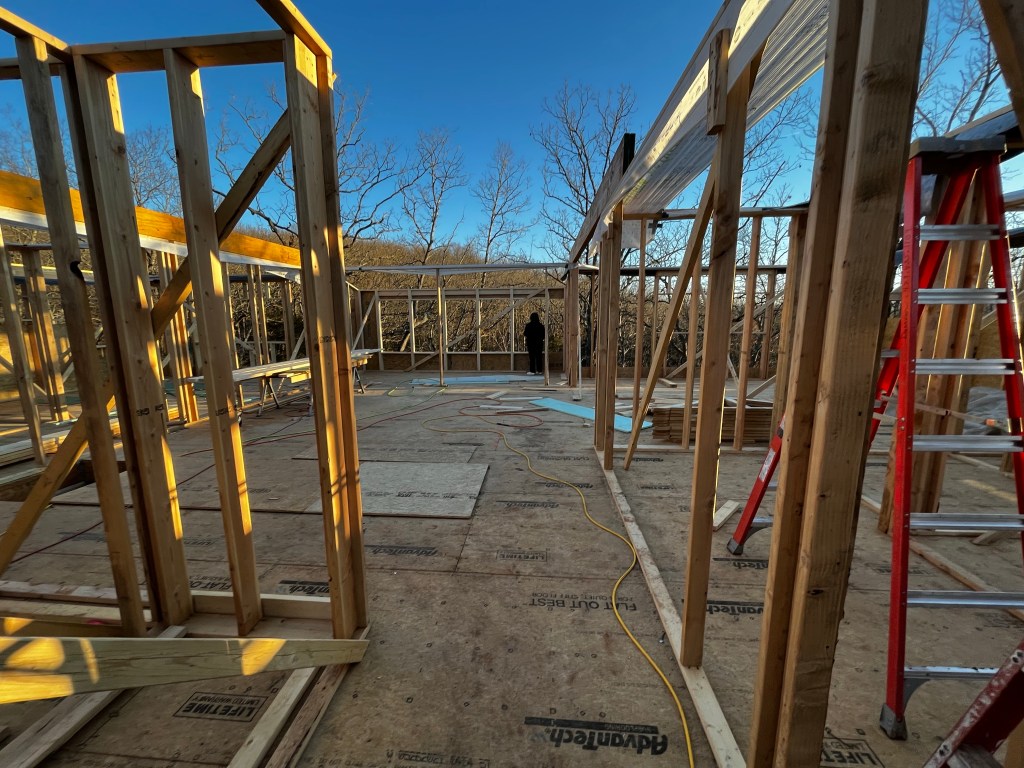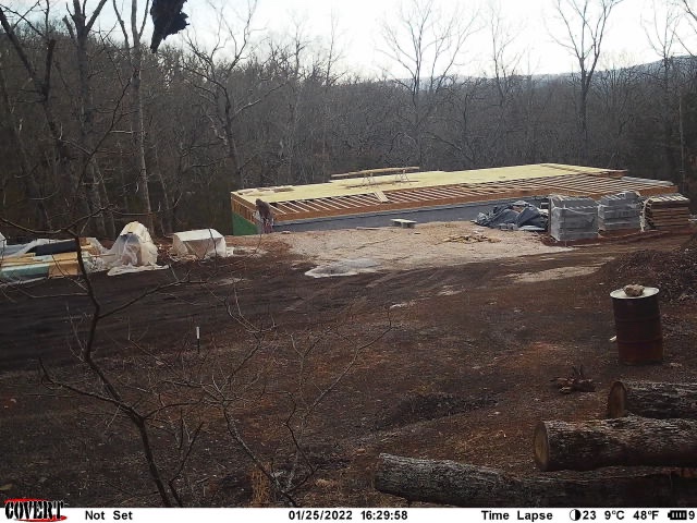 The interior build out, December 18th, the meaning of 10 foot ceilings (~3meters) entrance to Thomas’ bedroomAlex (the builder) enjoying the view December 22nd, sheathing progressing December 23? Dolly the neighbors’ hyperkinetic pup in a moment of petting.30th digging the foundation for the upper floor December 31st (Happy Birthday Thomas and Alex) Foundations dug and covered because (again!) heavy storms and cold weather predicted for the 1st and 2nd and we want to pour concrete on the 3rd…fingers crossed.SE corner, my office, finally finished with windows and sheathing. Ready to start the next floor when the beams come in again next week…making progress.Mama (Linda) very happy with a future paving stone 😊 We (she) cleaned up a lot of scrap wood on the site, while I watched the fire (actually writing but that’s the same thing right?)Jan 4 Delivery of the wooden I beam trusses/joists for the ceiling/floor.Jan 8th the footings for the upper part of the house are cured and ready for blocking.Jan 8th roof trusses in place, showing the sunroom overlap for the first time.Jan 11 Blocking begins..Jan 13th, flooring of the first section, while blocking is almost done.Jan 14th auto mixer and pump for the concrete block fill (also put in rebar)Jan 15, filled and plastic sheeting covered just in time. This photo like others is from my Trail Cam so it has the time and temp…it was colder than that this is with in-sol-action…Jan 18th, filled and reinforced, with the sill plates initially place,Jan 24 after another bout of very cold weather and snow.Jan 24th Linda checking out the root cellar Jan 25th, floor joists in for most of the first floor.